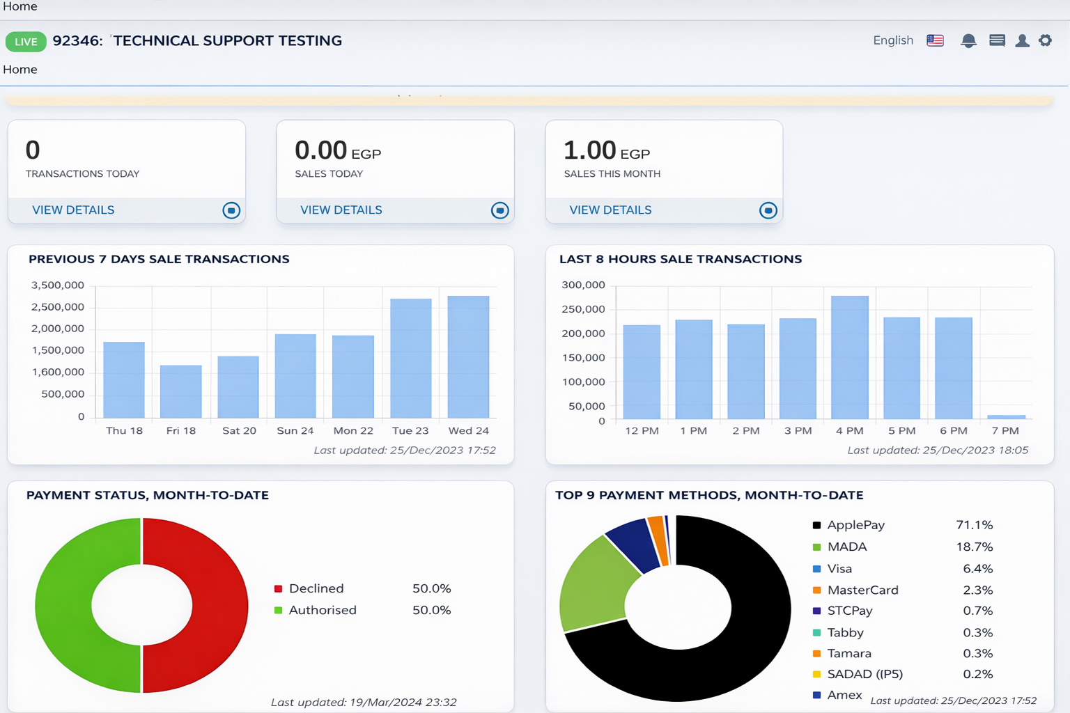 العرض التحليلى : يحتوي هذا العرض على نظرة عامه على حالات الدفع خلال الشهر، مثل نسب المعاملات المرفوضة والمصرح بها،