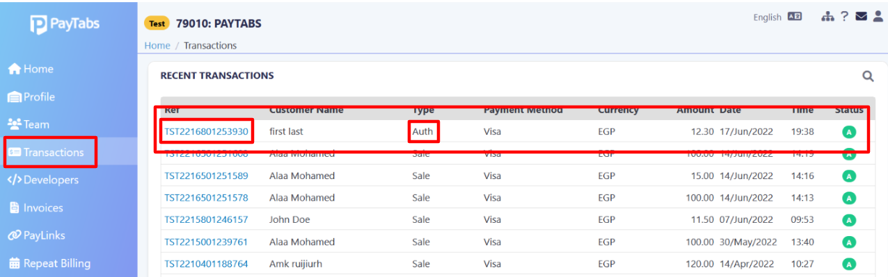- ثم اضغط على معاملة "المصادقة" المختارة التي تريد التقاطها، كما هو موضح أدناه: