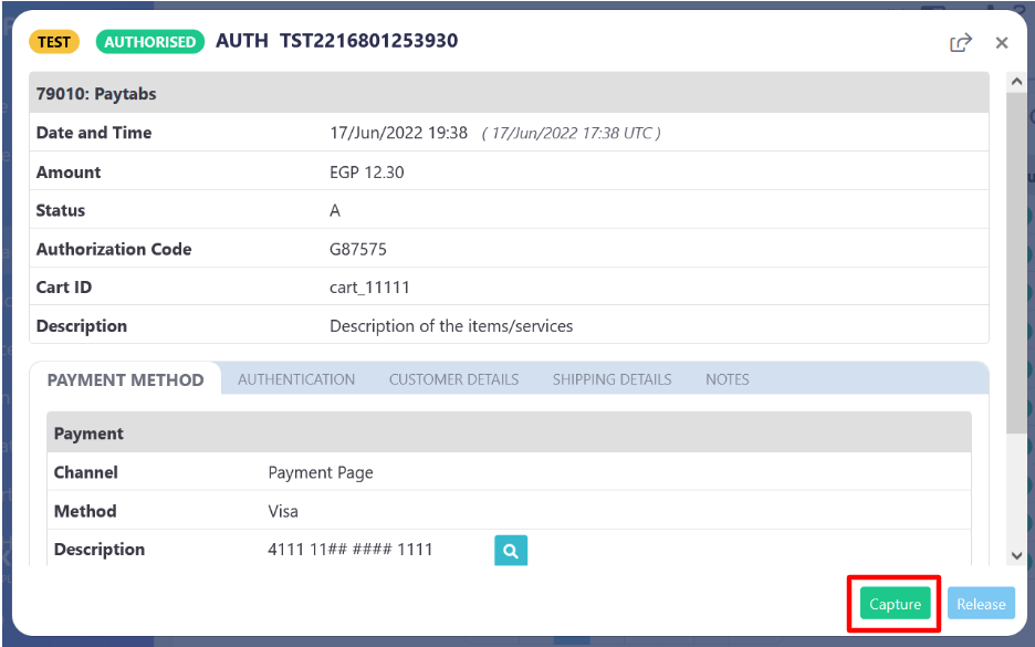 - بعد ذلك قم بالضغط على زر "التقاط" الأخضر الموجود أسفل صفحة عرض المعاملة كما هو موضح أدناه: