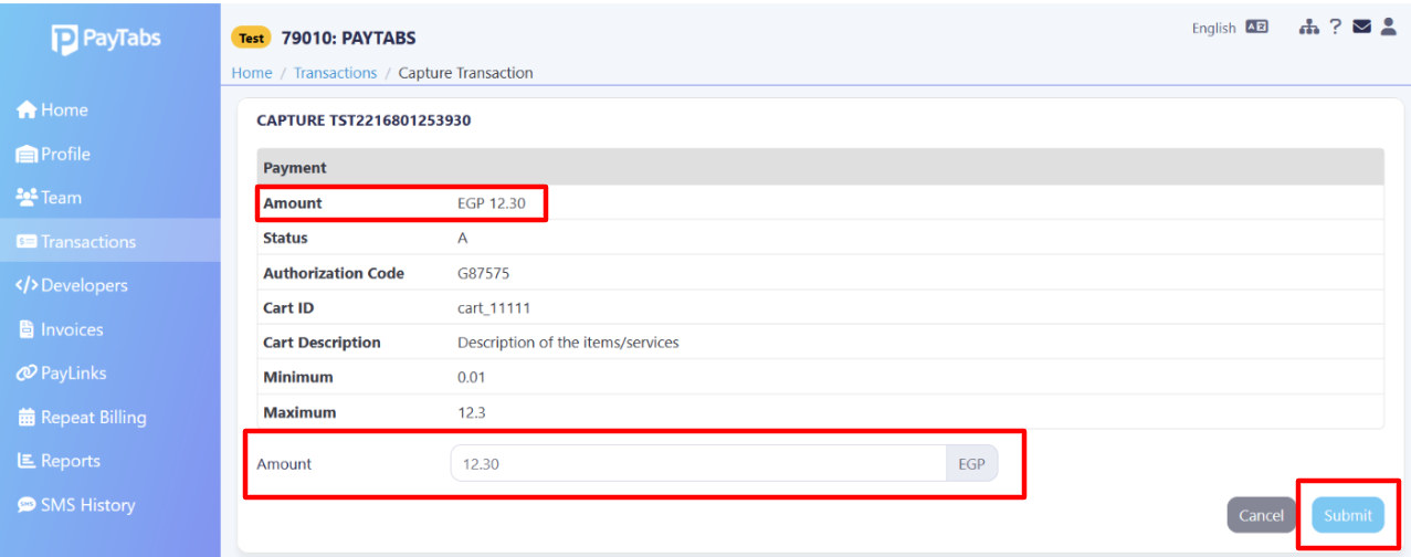- سيؤدي هذا إلى إعادة توجيهك إلى نموذج الالتقاط؛ بعد ذلك، سيتعين عليك تحديد مبلغ المعاملة بالكامل في حقل "المبلغ"، ثم الضغط على زر "إرسال".