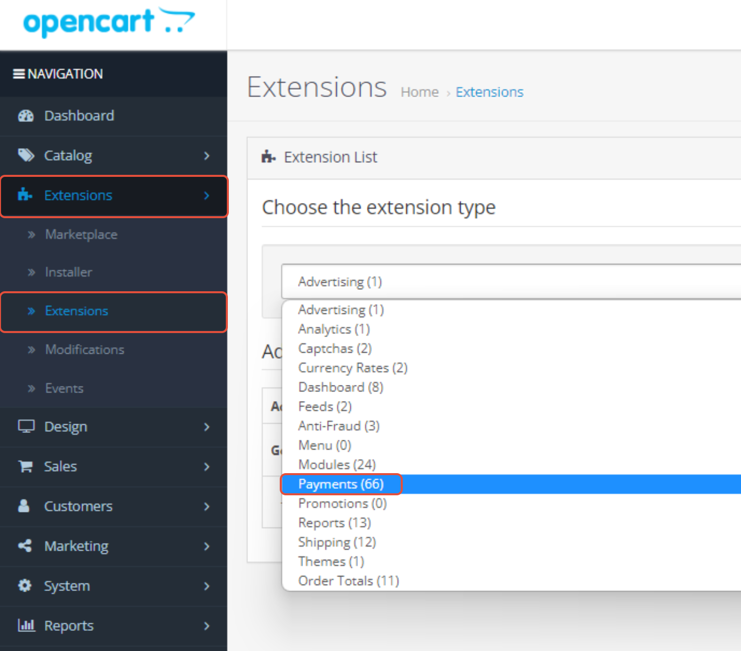 Note that you can create multiple payment page themes in your dashboard by following the steps mentioned in our How to customize the PayPage (Hosted Payment Page) UI? solution article.- From the OpenCart admin panel, go to the "Extensions" menu, then select "Extensions" from the dropdown menu.