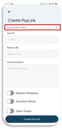 - Expand Extra Options (Optional): Click on Open Extra Fields to add advanced settings and enrich your PayLink with: